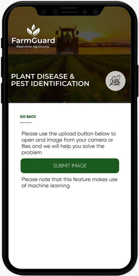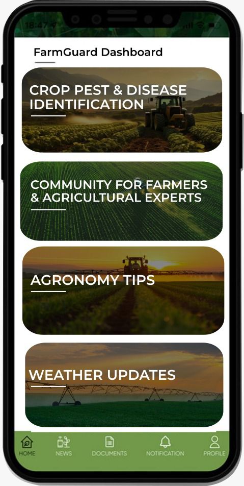 FarmGuard is an Artificial Intelligence and machine learning-based mobile application designed to aid farmers in accurately identifying crop pests, diseases, and nutrient deficiencies through uploaded images of affected crops. Through utilizing sophisticated algorithms, the application swiftly analyzes these images to provide precise diagnoses, empowering farmers with real-time insights into their crop health and proceed to treatment recommendations.